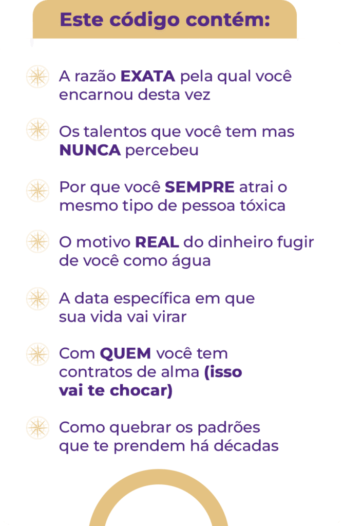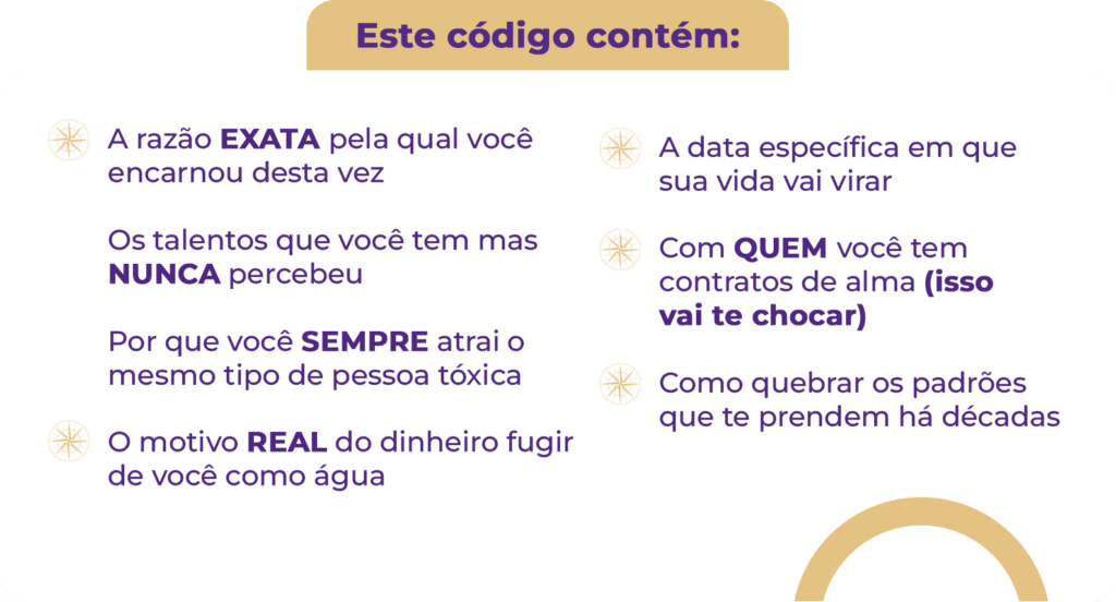 → Clareza total sobre sua missão de vida → Talentos específicos mapeados e como usá-los → Principais Bloqueios identificados e com orientação para solução
